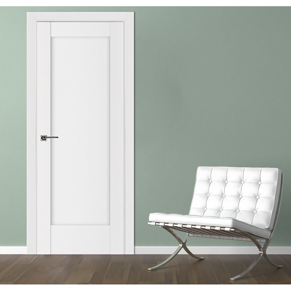 The Stile Series features slim vertical framing and bold geometric paneling, creating a clean, architectural look that stands out in any modern space. Optional metallic stripe accents add depth and sophistication, while solid pine and MDF core construction provide strength and a smooth, high-quality swing.